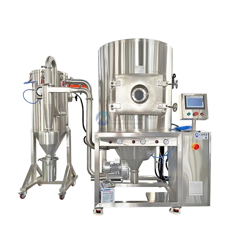 噴霧干燥機(jī)為開(kāi)式循環(huán),并流式,離心式霧化。干燥介質(zhì)空氣經(jīng)過(guò)初、中效空氣過(guò)濾器過(guò)濾后根據(jù)操作指令由鼓風(fēng)機(jī)吸取再經(jīng)加熱器加熱通過(guò)高效過(guò)濾器的熱風(fēng)分配器進(jìn)入噴霧干燥主塔。液體物料根據(jù)操作指令經(jīng)過(guò)蠕動(dòng)泵,進(jìn)入高速旋轉(zhuǎn)的離心噴頭,在離心力作用下被分散成小霧滴。在噴霧干燥主塔內(nèi),小霧滴與熱風(fēng)在充分接觸,沿其特定路徑進(jìn)行熱交換后被干燥成為產(chǎn)品,然后通過(guò)旋風(fēng)分離器實(shí)現(xiàn)分離,固體物料被收集,氣體介質(zhì)再經(jīng)過(guò)過(guò)濾后被排出。整套噴霧系統(tǒng)易清潔、無(wú)死角,符合GMP要求。